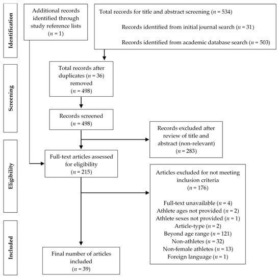 | PubMed | (“female” OR women) AND athlete* AND (“strength and conditioning”) AND (“blood flow restriction training” OR functional (assessment OR screening) OR technology OR sports) | Free full text, Full text, Humans, English, Adult: 19–44 years, Female, from 2011–2021. | |
