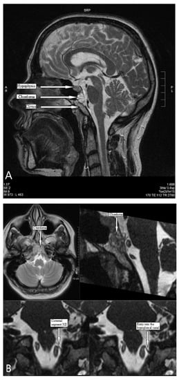Based on the initial neurological examination, an MRI of the neurocranium was performed. MRI imaging revealed an inhomogeneous, partly cystic, irregular, contrast-affinity lesion in the clivus with erosion of the cortical bone and incipient growth into the prepontine cistern, outside of brain parenchyma, suspected of a chordoma (Figure 2A,B). This was confirmed in cranial computed tomography in the bone window. No evidence of pathologies in the brainstem and in the cisternal course of the hypoglossal nerve up to the entrance into the hypoglossal canal were found. It was therefore not possible to determine any spatial relationship between the chordoma and the brainstem or the cisternal course of the hypoglossal nerve (Figure 2A,B). Thus, the chordoma could not be considered as the cause of palsy of the 12th cranial nerve.