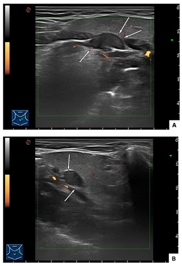 Consequently, in addition to the MRI of the neurocranium, an ultrasound examination was performed to clarify the morphological status of the hypoglossal nerve in its extracranial course. In the ultrasound scan (Figure 3A,B) was identified as a well-defined, rather homogeneous ovoid tumor measuring 14 × 7 × 6 mm along the path of the hypoglossal nerve, protruding into the submandibular space but clearly demarcated from the submandibular gland. Color flow mapping could not depict any vascular hilus structure but showed small vessels at the surface of the lesion. The nodal status of the neck was negative.