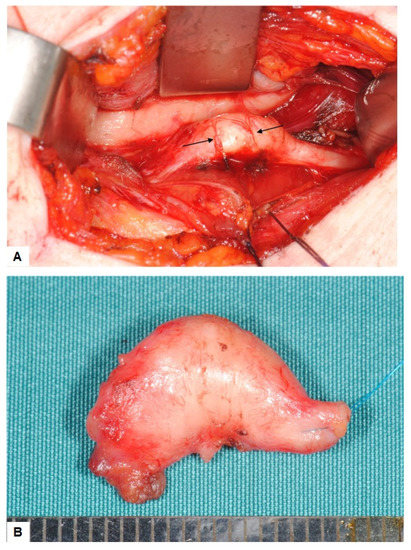 (A) Intraoperative findings: The tumor appears as a swelling of the hypoglossal nerve. As suggested by ultrasound findings, small vessels cross the surface. No adhesion to the surrounding tissues and especially no adhesion to the mylohyoid muscle is found. (B) Resection specimen: The tumor appears fully encapsulated by the perineurium When sectioned, there is no demarcation between the nerve and the tumor.