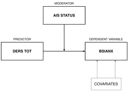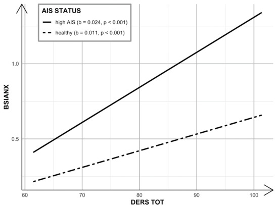 Subsequently [53], the PROCESS SPSS macro for moderation analysis with bootstrapping (5000 resamples with replacement) was applied in order to test insomnia diagnosis (based on the AIS cutoff score) as a potential moderator in the association between emotional dysregulation (DERS TOT score) on anxiety symptoms (BSIANX score). Biological sex and age were included as covariates (see Figure 2 for the conceptual model). Next, a simple slope analysis reflecting the “pick-a-point” approach was conducted to probe the significant interactions. This consisted of a set of regression tests (two in this case) that determined where in the distribution of the moderator the predictor influenced the dependent variable [54]. Nonstandardized coefficients are reported throughout the paper.