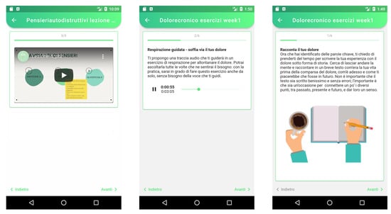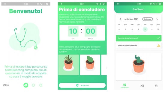 The project has already been approved by the Internal Review Board (IRB) of the University of Milan-Bicocca at the beginning of the year 2021 (protocol number: 0018862/21; date: 16 February 2021). The study will be organized into two phases. The first phase, which has already been completed, focuses on the IB-MAI design and implementation. An in-depth analysis of current IBIs was conducted to design the IB-MAI. This allowed us to analyze the strengths and limitations of different approaches and use these observations to guide the development of the intervention. Our IB-MAI was designed as a mobile app for both Android and iOS to increase the number of potential users. MindBlooming provides a set of psychoeducational videos (with transcripts) about the psychological issues faced during treatment, as well as questionnaires and exercises to collect information before, during, and after the treatment itself. We followed the design principle of Material Design [30], which is a system of guidelines, components, and tools that support the best practices of user interface design and specify theories and practical applications of the interaction among human and machine for mobile development. The user interface (Figure 1) has been developed following the current usability standards, and it comprises features such as reminders, nudges, a calendar, and a diary.