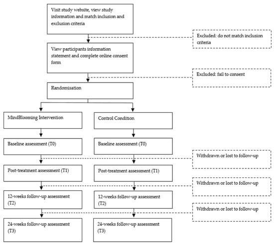 This study will be conducted in accordance with the Consolidated Standards Of Reporting Trials (CONSORT) checklist for the RCT design [34]. Participants will be randomly assigned following blind simple randomization procedures when they complete the baseline assessment (randomization sequence under computer control adopting computerized random numbers) to 1 of 2 treatment groups (see Figures S1 and S2 for the study design and assessments). We only keep the 1:1 ratio constraint at the 260th participant, meaning that when one group reaches 130 participants, all the remaining volunteers (up to the total of 260) will be allocated to the other group. Students will be randomized to IB-MAI or CC. Participants in the intervention condition will receive an 8-week unguided IB-MAI program, i.e. MindBlooming. Participants in the CC condition will access websites with information about their specific areas of distress identified at baseline. Participants will be assessed with repeated measures (baseline, 8 weeks, 12 weeks, and 24 weeks). The RCT participants’ flow is presented in Figure 2.
