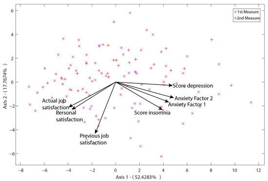 A p-value < 0.05 was considered significant. Means and standard deviations (SD) were used to analyze the descriptive statistics, as well as percentage differences and coefficients of variation (CV). Cohen’s d, Hedge’s g, Δ2 Glass, and R2 were also used as indicators of effect size. For the analysis of insomnia, our sample was compared with a very similar sample made up of health professionals (doctors and others) from the 12 de Octubre hospital in Madrid and people whose jobs were not health care (control group). For the analysis of the correlations between variables, bivariate correlations using Pearson’s correlation coefficient were used. The multivariate analysis of satisfaction, anxiety, depression, and insomnia was performed using principal component analysis of HJ-Biplot [28] and the MultBiplot software, 09-01-2020 version [29]. Additionally, SPSS v.25 [30] was used for the remaining analyses.
