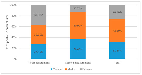 Differences were found between the two measurements, with an increase in clusters 1 and 2 and a decrease in cluster 3. The number of people with extreme mental health distress decreased, while the number of people who were reported to have minimal to medium mental health distress increased (Table 12).