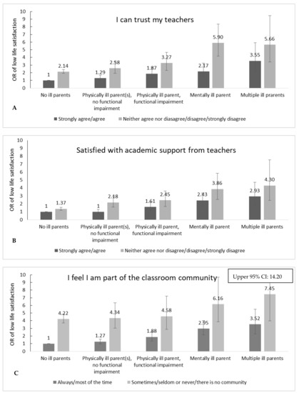 3.2. Joint Effect of School-Related Factors and Parental Illness on Life Satisfaction
