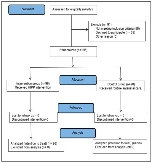 Initially, 287 pregnant women with anemia were screened for eligibility during data collection. In total, 58 women were excluded from the study because they did not meet the inclusion criteria and 33 women refused to participate. Finally, 196 women were randomly assigned into the intervention group (98) and the control group (98). Figure 1 summarizes the study flow diagram.