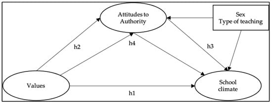 Considering the theoretical and conceptual background previously exposed, this study sought to fill the gaps in school research by examining the roles and relationships of the explanatory factors of the school climate, such as values and attitudes towards authority. While there are studies of great international relevance that highlight the relationship between values and school climate [3,4], that relationship has hardly been explored [52], which is why this study aims to examine the direct and indirect relationships between values, attitudes towards authority, and school climate. To reach this objective, this study proposed four hypotheses, which are represented based on Figure 1: (Hypothesis 1) values have direct and significant relationships with the school climate; (Hypothesis 2) values have direct and significant relationships with attitudes towards authority; (Hypothesis 3) attitudes towards authority have direct and significant relationships with school climate; and (Hypothesis 4) values have an indirect and significant relationship with school climate through attitudes towards authority. Additionally, sex and type of education were included as control variables in the model, given their potential effects [18,29,30,32,37,56].