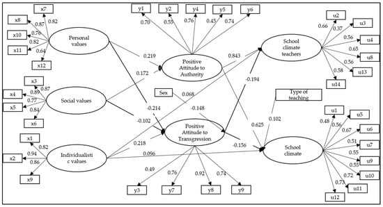 Finally, the fourth hypothesis posed the following: (h4) values have an indirect and significant relationship with school climate through attitudes towards authority. The results suggest maintaining this hypothesis, given that the model with the best fit was the model of relationships between school climate and values mediated by attitudes towards authority. This study highlights that school climate, which is located in the microsystem [1], is indirectly influenced by values in personal, social, and individualistic dimensions through attitudes towards authority. It is relevant to note that these values are primarily obtained in the family microsystem [53], but are also influenced by more distant subsystems, such as the macrosystem [54], impacting individual and group behaviors such as school climate [7]. In this sense, it is relevant to point out that the promotion of adolescent values, which can be learned in the family, educational institutions, or society, will indirectly and positively impact school relationships, which at the same time will be influenced by attitudes towards authority referents. This triad is relevant in the context of adolescence, which, as indicated in the adolescent positive development approach, is an evolutionary stage of great plasticity in which adolescents can achieve healthy development by displaying all of their potentialities [46]. It is relevant to note that the effects between the variables were controlled according to sex and type of teaching, and, in this regard, both variables were statistically significant in the model. The significant effect of the sex variable on positive attitude to transgression stands out, where it can be observed that men presented higher levels of transgression. These results are consistent with previous literature [37,39,40]. Regarding the effects of type of teaching, the results presented a statistically significant relationship with school climate, where it can be observed that the scientific-humanistic schools presented a better perception of school climate, compared to the technical-professional schools. These results are consistent with previous studies [30,37,56].