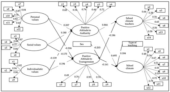 The second hypothesis posed the following: (h2) values have direct and significant relationships with attitude towards authority. The results allowed us to maintain this hypothesis, as social values and personal values were found to have significant and negative relationships with attitudes towards transgression and positive relationships with favorable attitudes towards authority; in the same way, the individualistic values factor presented positive relationships with the factor attitudes towards transgression and negative relationships with the factor favorable attitude to authority. In this regard, personal values, which characterize adolescents with higher levels of responsibility, moral integrity, and honesty, are positively related to attitudes of respect for authority, which refers to school regulations, teachers, and the police [38]. These results are consistent with research that suggests that students with favorable attitudes towards authority show greater respect for their teachers [37]. The results regarding the positive relationship between individualistic values and transgressive attitudes are consistent with previous studies, given that students who show a greater tendency towards individualistic values (hedonism) present a higher cannabis consumption [68], greater tendency towards materialism [51], and deteriorated school climate [42].