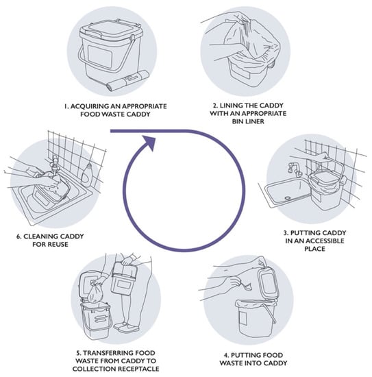 Successful food waste recycling, however, relies on high rates of food waste collection by local authorities []. This, in turn, relies on citizens correctly segregating their food waste for collection. Several different systems for collecting food waste were implemented across Europe. There are highly efficient systems based on source separation of food in Austria, Slovenia, Belgium and Germany where the bio-waste capture rate (This percentage represents food waste collected as a percentage of food waste generated) is over 60% []. The success of these systems is owed, in part, to technical factors, i.e., widescale implementation of a simple to use, nationally uniform, efficient and reliable waste collection service. It is also owed to high citizen engagement with food waste recycling schemes which was achieved through effective behaviour change interventions, including educational and motivational public campaigns to create positive social norms about household food recycling and the provision of free bins and compostable liners []. Citizen behaviour is therefore critical for initiating the end-of-life pathway of food waste, ensuring recycling takes place.