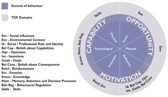 A more granular, elaborated version of COM-B is the Theoretical Domains Framework (TDF; Appendix A) []. The TDF comprises 14 theoretical domains, representing the individual, socio-cultural and environmental factors influencing behaviour. These domains include people’s knowledge and skills, memory, attention and decision-making processes, beliefs about capabilities and consequences, goals and emotions as well as physical and social environmental factors. The relationship between COM-B components and TDF domains are shown in Figure 3. Both COM-B and TDF are used by researchers, policymakers and intervention designers to identify modifiable influences on a target behaviour to inform interventions and policies.