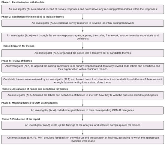 Thematic analyses, in line with the approach described by Braun and Clarke [], were used to identify: (a) reasons for not recycling food waste via council collection; (b) reason for not using compostable caddy liners and; (c) reasons why participants do not feel ready for nationwide food waste collection. Thematic analyses were conducted by the lead author—a behavioural scientist and circular economy expert—and in the steps depicted in Figure 4.