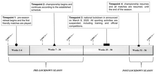 This was a prospective cohort study performed in a professional elite football club in the Italian Premier League during the 2018–2019 and 2019–2020 seasons up until after the lockdown due to the COVID-19 pandemic (Figure 1). All players were evaluated five times during the study: i.e., T0, T1, T2, T3, and T4. As shown in Figure 1, T0 was scheduled before the start of the preparatory period (week 0; middle July); T1 was about at the beginning of the championship (week 14; October); T2 was programmed in the middle of the championship (week 25; January); T3 was in March (week 35); and T4 was at the end of the season (week 51; June).