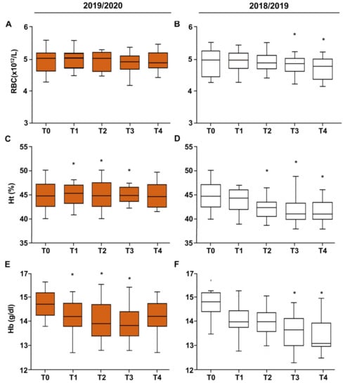 The effects of training on serum red blood cells (A,B), hematocrit (HT) percentage (C,D), and hemoglobin concentration (E,F) in football players during the 2018/2019 and 2019/2020 seasons. Box and whiskers representation of red blood cells, hemoglobin concentration, and hematocrit (HT) percentage evaluated five times (T0, T1, T2, T3, and T4) during the seasons. In this representation, the central box covers the middle 50% of the data values, between the upper and lower quartiles. The bars extend out to the extremes, while the central line is at the median. p-values were obtained by Student’s paired t-test between each timepoint and T0. * p < 0.05.