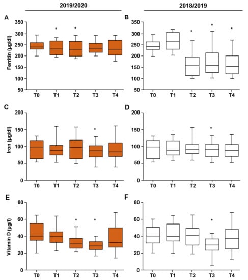 The effects of training on serum ferritin (A,B), iron (C,D), and vitamin D (E,F), concentration in football players during the 2018/2019 and 2019/2020 seasons. Box and whiskers representation of serum ferritin, iron, and vitamin D evaluated five times (T0, T1, T2, T3, and T4) during the seasons. In this representation, the central box covers the middle 50% of the data values, between the upper and lower quartiles. The bars extend out to the extremes, while the central line is at the median. p-values were obtained by Student’s paired t-test between each timepoint and T0. * p < 0.05.