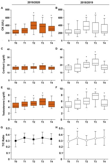 Testosterone concentration increased in both seasons from T0 to T3 and, at the end of the season, it decreased toward initial levels; although such a decrement was statistically significant in both seasons (p < 0.05), it was higher in the 2018/2019 season (Figure 4E,F).