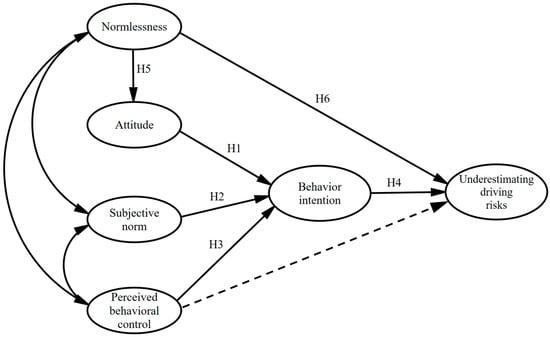 Previous studies have shown that the tendency to underestimate risk has multifactorial properties and is inseparable from the intrinsic characteristics of drivers. The theory of planned behavior (TPB) has emerged as a solution to address this issue; it is based on the core idea that behavioral intention is a determinant of behavior and that three cognitive factors, namely the attitude, subjective norm, and perceived behavioral control, jointly influence behavioral intention []; the stronger the behavioral intention, the more likely the manifestation of the behavior. Currently, the TPB has been widely used to explain traffic behaviors, such as fatigue driving [], use of mobile communication devices while driving [,,], yielding behavior [], and lane grabbing []. The TPB has shown good validity in explaining various human behaviors [,]; for example, combined with the theory of reasoned action (TRA) and TPB studies in a meta-analysis, Sutton showed that these theoretical models explained, on average, 40–50% of the variance in intentions and 19–38% of the variance in behavior []. This finding is generally accepted in human behavior research []. In summary, the TPB seems to be a feasible approach to study a driver’s underestimation of risky behaviors by examining individual characteristics to analyze specific behaviors and thus improve the predictability of driver intentions []. It has been established that the stronger the driver’s perceived behavioral control, the more likely the driver is to underestimate driving risks []. In addition, there is a significant correlation between risky driving attitudes and risk perception []. Hence, the TPB model can provide a technical support to explore the psychological factors associated with the underestimation of risky driving behavior.