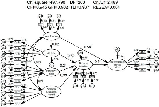 Table 3 presents the results of correlation analysis. From Table 3, there was a significant correlation between N, ATT, SN, PBC, IN, and URB. Therefore, it is feasible to use the SEM to explore the interaction between the ETPB model and driver underestimation risk behavior.