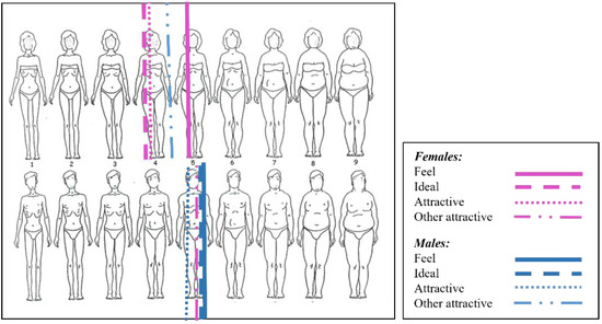 - Furnham, A.; Hester, C.; Weir, C. Sex differences in the preferences for specific female body shapes. Sex Roles 1990, 22, 743–754. [Google Scholar] [CrossRef]