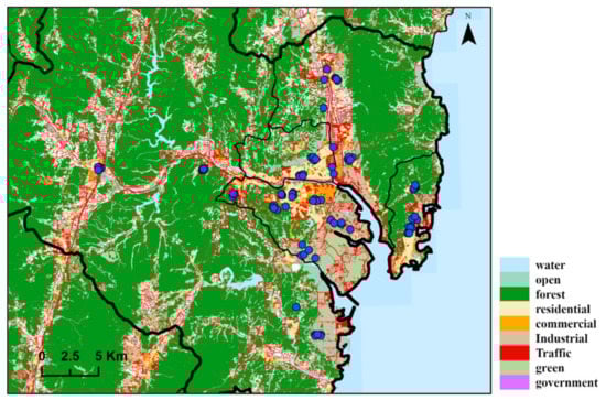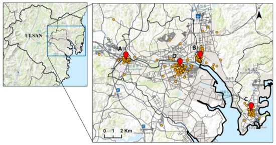 The area depicted by land use and 87 noise monitoring sites in Ulsan.