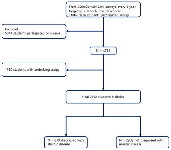 Inclusion criteria were: (1) participate in more than one survey; (2) complete the question “Have you been diagnosed with any of the following diseases last year?; atopic dermatitis, asthma, or allergic rhinitis”. Specific exclusion criteria were as follows: (1) underlying allergic disease determined by the question “Have you ever diagnosed with any of the following diseases once?; atopic dermatitis, asthma, or allergic rhinitis” at their first survey; (2) missing answers on questions asking “address”, “sex”, and “age”. Based on these criteria, a total of 2972 students remained. Among those, 670 students were diagnosed with allergic disease during the study period, while 2302 students were not (Figure 2).