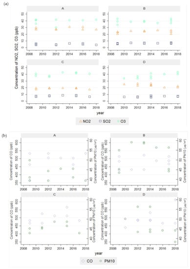 Air pollutant concentration each year by the school; (A) represents the coastal environment, (B) represents the residential area, (C) represents the industrial area, (D) represents the downtown area. (a) estimated concentration of NO2, SO2, O3 without showing a distinct pattern (b) estimated concentration of CO and PM10 without showing a distinct pattern.