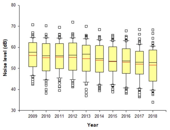In this study, the LUR model was constructed using the noise monitoring data and geographic information in Ulsan. Variables with low correlation were rearranged through stepwise linear regression analysis in estimating the noise level at the location of the subjects in the questionnaire. The annual average noise level from 2009 to 2018 at each subjects’ location predicted through the LUR model was in the range of 51.4 to 56.2 dB (Figure 5). The model R2 explaining the variability in the noise levels for all LUR models ranged from 0.48 to 0.59. The LUR models for noise levels largely included commercial, industrial variables with 1000 m buffer, road length with 50 m, and 1000 m buffer. Comparing the time trend in noise level by each school, the overall annual noise level by subjects from each school decreased over the time period (Figure A1), although there was a slight difference by the school (Figure A2). We found out that most levels exceeded the permissible noise limits of 40 dB of the general residential area, and some of them even exceeded the permissible noise limit of 55 dB of the roadside area under the Framework Act on Environmental Policy.