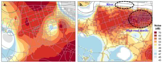Noise mapping of part of Ulsan region (a) noise map based on noise level estimated from Kriging method, (b) noise map based on noise level estimated from LUR model.