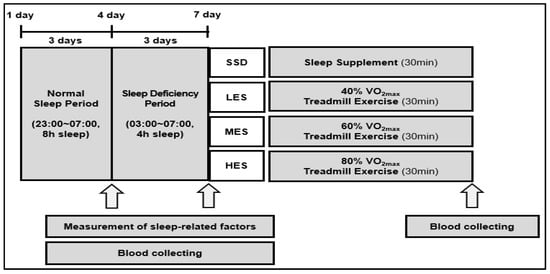 To determine the participants’ exercise intensity, participants were measured on maximal oxygen uptake by a graded exercise test using a treadmill one week before the normal sleep (NS) period. After measuring maximal oxygen uptake, all participants underwent two sleep conditions. Referring to previous studies [,], the first sleep condition was NS of 8 h (23:00 to 07:00) for 3 consecutive nights, whereas the second sleep condition was SD of 4 h (03:00 to 07:00) for 3 consecutive nights. During the SD period, participants spent time reading a book, watching television, or playing internet games before sleeping. After a 3-day SD period, the participants performed 30 minutes of treatment according to their assigned group. For blood analysis, the participants’ blood samples were collected three times—after NS, after SD, and after group treatment (AT) (see Figure 1).