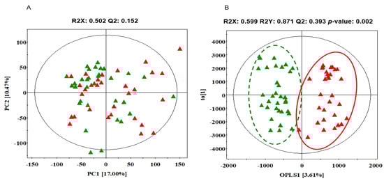 PCA and OPLS-DA score scatter plot based on GC-TOF-MS chromatographic data between NS and SD. PCA score scatter plots (A) and OPLS-DA score scatter plots (B) of serum extracts analyzed by GC-TOF-MS. Red filled triangles, NS; green filled triangles, SD. GC-TOFMS: gas chromatography-time-of-fight mass spectrometer, PCA: principal component analysis, OPLS-DA: orthogonal partial least squares discriminant analysis, NS: normal sleep, SD: sleep deficiency.