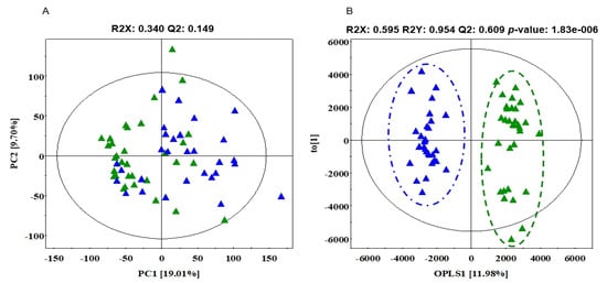 PCA and OPLS-DA score scatter plot based on GC-TOF-MS chromatographic data between SD and AT. PCA score scatter plots (A) and OPLS-DA score scatter plots (B) of serum extracts analyzed by GC-TOF-MS. Green filled triangles, SD; blue filled triangles, AT. GC-TOFMS: gas chromatography-time-of-fight mass spectrometer, PCA: principal component analysis, OPLS-DA: orthogonal partial least squares discriminant analysis, SD: sleep deficiency, AT: after treatment.