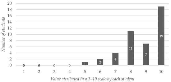 Students’ assessment of the app as a self-learning tool to improve students’ knowledge on the matter and other competencies covered in the subject. The values are expressed on a 1–10 scale.