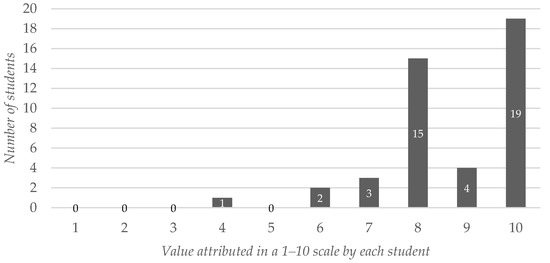 Similarly, when answering the same question but referring to “general knowledge and competencies of the subject”, 38 out of the 44 participants (86.36%) answered with a value of 8 or higher. The average value attributed to the app as a tool useful for meeting the general requirements of the subject was 8.70 (SD: 1.40), shown in Figure 3.