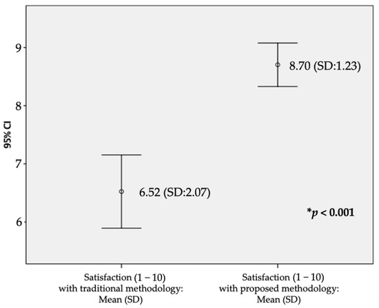 Satisfaction (1 − 10) of students with both teaching methodologies. Mean (SD). * The difference was found statistically significant.