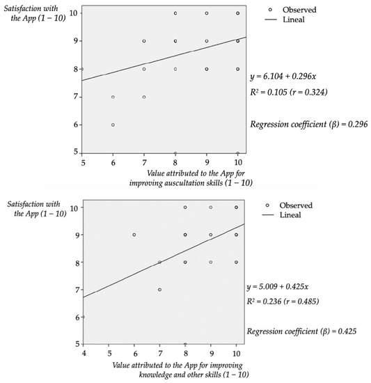 Regression lines correlating the expected satisfaction with a methodology that incorporates the app and the value attributed to it as a learning tool, first for “auscultation skills” and second for “general knowledge and other skills”.