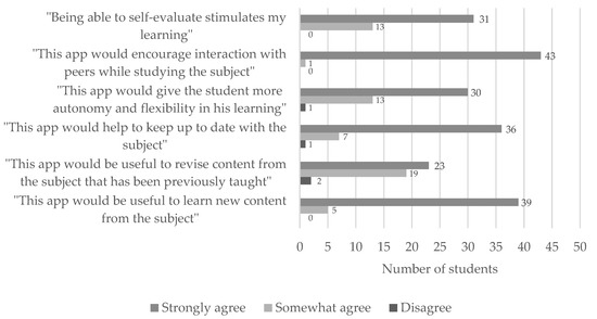 The context in which the new tool is used and evaluated is critical for understanding its potential but analyzing its intrinsic characteristics might help us predict the extent of its utility under other circumstances [37]. We have evaluated the different characteristics of the app through a qualitative approach, as shown in Figure 6. Our initiative attracted encouraging feedback from students, who coincided in highlighting benefits already suggested by other authors for M-Learning schemes, such as the opportunity to self-evaluate through tests [26,52], the greater autonomy [21], the possibility to interact with other students [53], and higher flexibility in their learning process [54], facilitating the task of keeping up-to-date with the subject. A majority of our participants considered the app useful not only for revising and consolidating knowledge [55] but also for learning new topics [22]. Last but not least, the encouragement of a student-centered teaching methodology enhances the acquisition of other soft skills such as time management [56], although this may mainly benefit high achieving students, according to some authors [57].