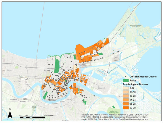 Map of the study area showing psychological distress scores by block group, and locations of parks and off–site alcohol outlets. Only block groups with study participants are shown.