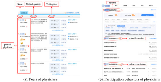 On the Haodf.com platform, physicians and patients are two main types of users. For physicians, they can communicate with patients through online consultation to understand patients’ condition and make treatment plans. In addition, physicians can share knowledge on the platform according to their own experience, for instance, publish scientific articles to show their skills to patients. For patients, they can select a suitable physician for consultation by viewing the information about physicians, including the physician’s professional title, recommendation popularity, number of published articles, reviews and online consultations. After receiving the consultation services, patients may post reviews to share their experiences, and rate their satisfaction with physicians.