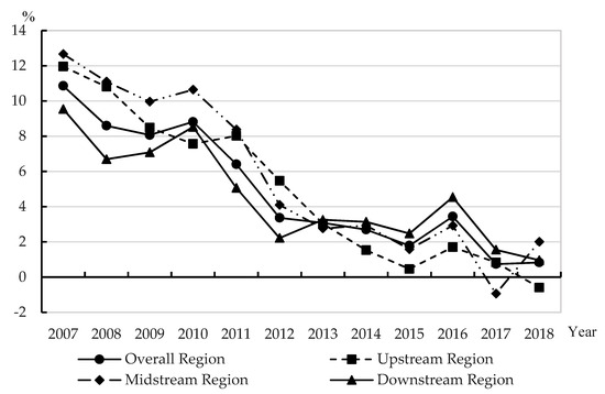 From a region perspective, from 2007 to 2018, the TFP growth rate (tfp) of the upstream region, midstream region and downstream region was consistent with that of the overall region and showed a gradually decreasing trend. Since the capital elasticity coefficient α is uniformly 0.7 in this paper, the differences between regions have been reduced to a certain extent, and the actual differences should be larger. From the absolute value from 2007 to 2012, the TFP of the midstream region was the highest, followed by the upstream region, and that of the downstream region was the lowest. From the relative value from 2013 to 2017, the TFP growth rate (tfp) of the downstream region was the highest, followed by the midstream region, and that of the upstream region was the lowest. In 2018, the TFP growth rate (tfp) of the midstream region ranked first, while that of the upstream region was negative. The difference between the upstream region, midstream region and downstream region shows a trend of first expanding and then narrowing. Summary statistics of tfp in the four regions are shown in Table 3.