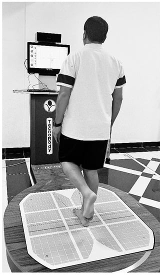 Postural stability was assessed with a stabilometric force platform (IsoFree medical equipment, Tecnobody S.R.L., 2015). It consists of four primary components: (1) a stabilometric posture, (2) a 3D camera, (3) a touch screen, and (4) specialized software, all of which work together to analyze movement and postural control while providing real-time feedback (Figure 2).