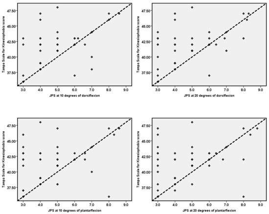 Kinesiophobia showed a significant positive correlation (moderate) with the ankle JPS in dorsiflexion (10°: r = 0.51, p < 0.001; at 15°: = r = 0.52, p < 0.001) and plantarflexion (10°: r = 0.35, p = 0.009; at 15°: = r = 0.37, p = 0.005). Kinesiophobia also showed significant positive (moderate) correlation with postural control variables (ellipse area: r = 0.44, p = 0.001; Anterior–Posterior sway: r = 0.32, p = 0.015; Medial–Lateral sway: r = 0.60, p < 0.001).