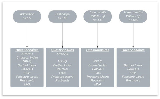 Functional status was measured with the Barthel Index [24,25]; comorbidities were measured with the Charlson Comorbidity Index [26,27]; pain was measured with the Pain Assessment in Advanced Dementia Scale (PAINAD) [28,29]; neuropsychiatric symptomatology was evaluated with the Neuropsychiatric Inventory Questionnaire (NPI-Q) [30,31]; and nutritional status was checked using the Mini Nutritional Assessment (MNA) [32]. All questionnaires used were the Spanish versions and are valid and reliable. See Figure 1 for data collection and measurements.