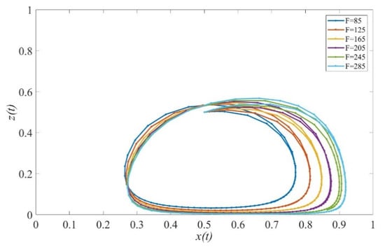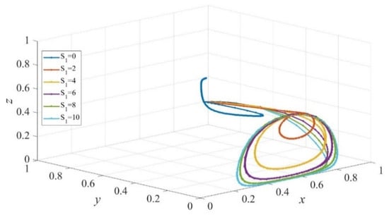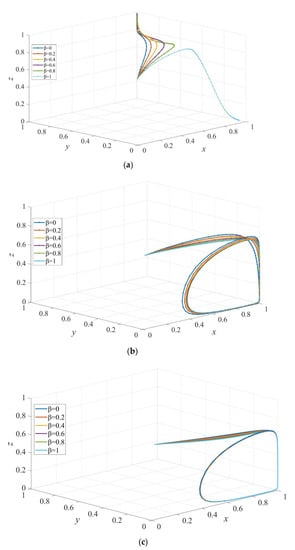 Figure 9 is plotted to investigate the effect of the acceptance level of elderly care services of consumers on strategies evolution. It is evident that subsidizing elderly people who hold institutional care strategy induces the emergence of an ESS: when , in Figure 9a. However, the system does not have an evolutionary stable point when , as presented in Figure 9b,c.