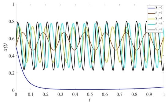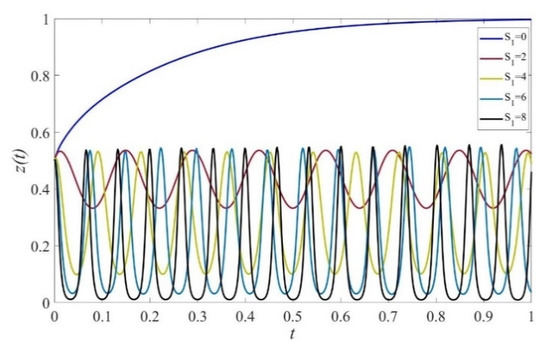 Figure 2 shows that when , the probability for private sectors to provide high-quality services decreases first and then increases. This occurs because governments actively supervise the quality with a relatively high and stable probability, as depicted in Figure 4. In cases of , the probability of providing high-quality elderly care services increases with the increase of the subsidy scale. However, the evolution path fluctuates over time and no stable strategy exists, which verifies the result shown in Figure 1. Furthermore, as the scale of subsidy increases, governments are more likely to adopt negative supervision because of excessive expenditure cost, and the evolution path fluctuates more dramatically, as shown in Figure 4. Figure 3 shows that consumers maintain the strategy of HC under any given values of .