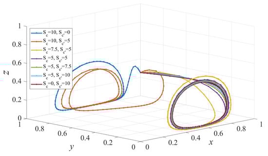 As shown in findings unfolded in Figure 6, identical subsidies to elderly people choosing institutional care and home-based care service lead the evolution system to the cyclical state in cases of and , while (1, 0, 0) becomes the ESS when . When the subsidy to elderly people preferring institutional care is significantly larger than that to those who choose home-based care strategy, is the ESS, which indicates that governments and private sectors adopt strategies of AS and HQ, respectively. It can also be seen that the evolution rate increases as decreases. Comparing with the results shown in Figure 6, we can conclude that a larger amount of subsidy to the purchase of institutional care services and higher reputation benefits can promote the emergence of . However, the equilibrium vanishes and strategies evolve into a cyclical state when , as indicated in Figure 8a,b. is the ESS when in cases of , implying that a small difference of service cost promotes private sectors to provide high-quality services.