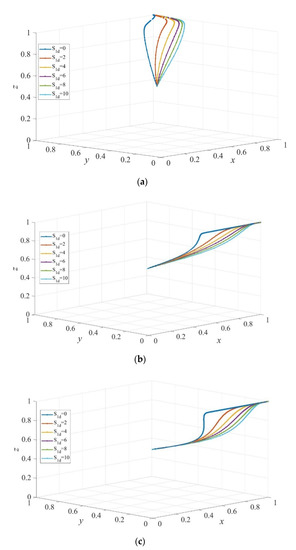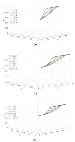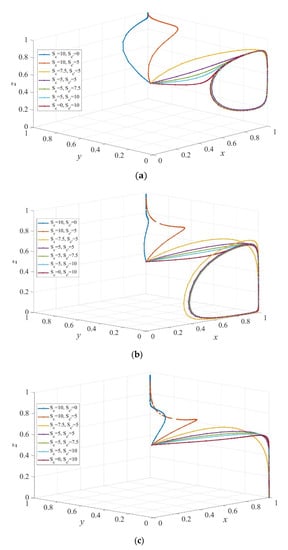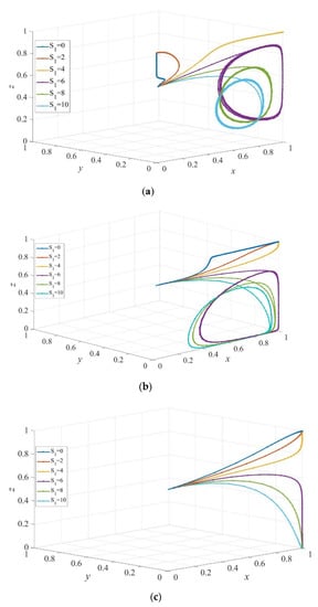 To further test how dynamic subsidy policy affects the strategy evolution, we assume that governments subsidize private sectors and consumers dynamically at the same time. As shown in Figure 11a, the evolutionarily stable strategy is (1, , 1), where . That is, the elderly people choose institutional care with a certain probability regardless of the maximum subsidy when the maximum value of the subsidy to consumers taking the strategy of institutional care is more than that to those who choose home-based care. Comparison between Figure 10b,c and Figure 11 shows that the dynamic subsidy to consumers decreases the evolution rate of the system to the equilibrium point .