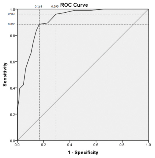 MINI 6.0 diagnosis for current MDE was used as the criterion standard. Based on the ROC analysis with the reference criterion standard, the QIDS-SR16 (Malay version) provided evidence for good validity with robust area under the curve of 0.916 (p < 0.000, 95% CI 0.884–0.948). The optimal cut-off for Malay QIDS-SR16 was 9 points with a sensitivity of 88.5% and specificity of 83.2%. With a lower cut-off at 7 points, the sensitivity was 96.2% and specificity was of 70.5%, providing a higher yield in detecting MDE (Figure 1, Table 4) with an expense of higher false positive rate.
