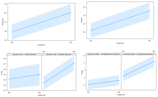 The direction of the association between lifetime SV, depression, and anxiety are shown in the first two graphs of Figure 1. The last two graphs show the interaction effect between lifetime SV and education level and between lifetime SV and perceived health status in the case of PTSD.