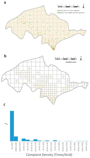 Analysis grids and noise monitoring and complaints. (a) noise monitoring grids and sampling locations; (b) analysis grids and noise complaint locations; (c) histogram of the everyday life-related noise complaints in the analysis grids.